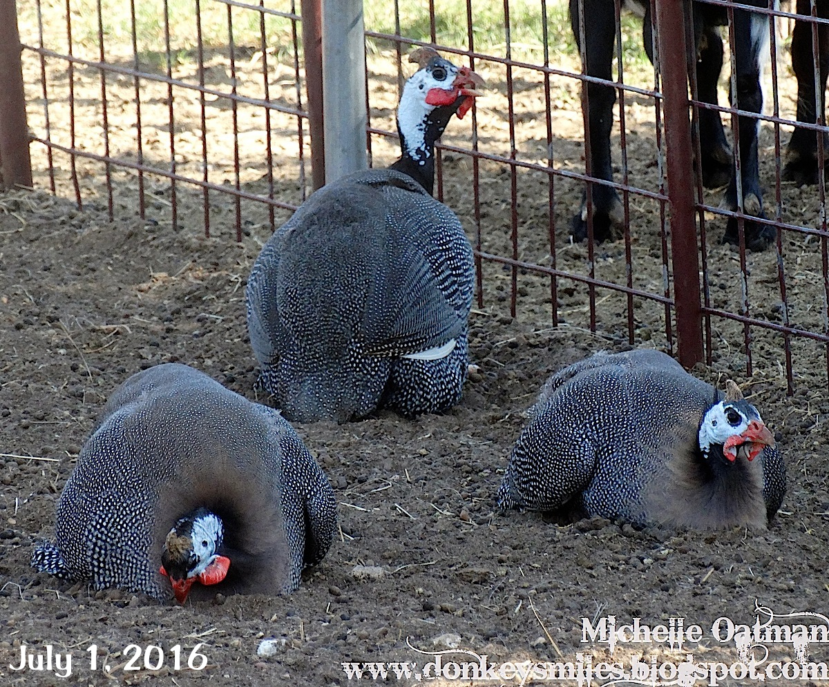 Found that the Guineas had claimed the largest shade under a tree in the pen. Poor goats have to find other shade.