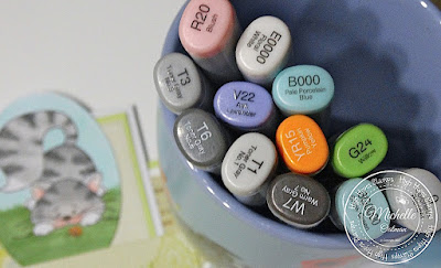 I colored with my Copics (colors below) and then cut out with a Spellbinders Nestie. Papers from Websters Pages that are all sewn down. A Whimsy Square Doily Die for the pocket and the Whimsy Stamps Happy Birthday die cuts.